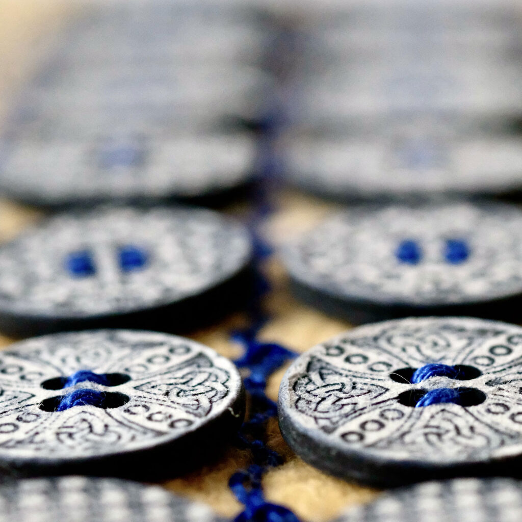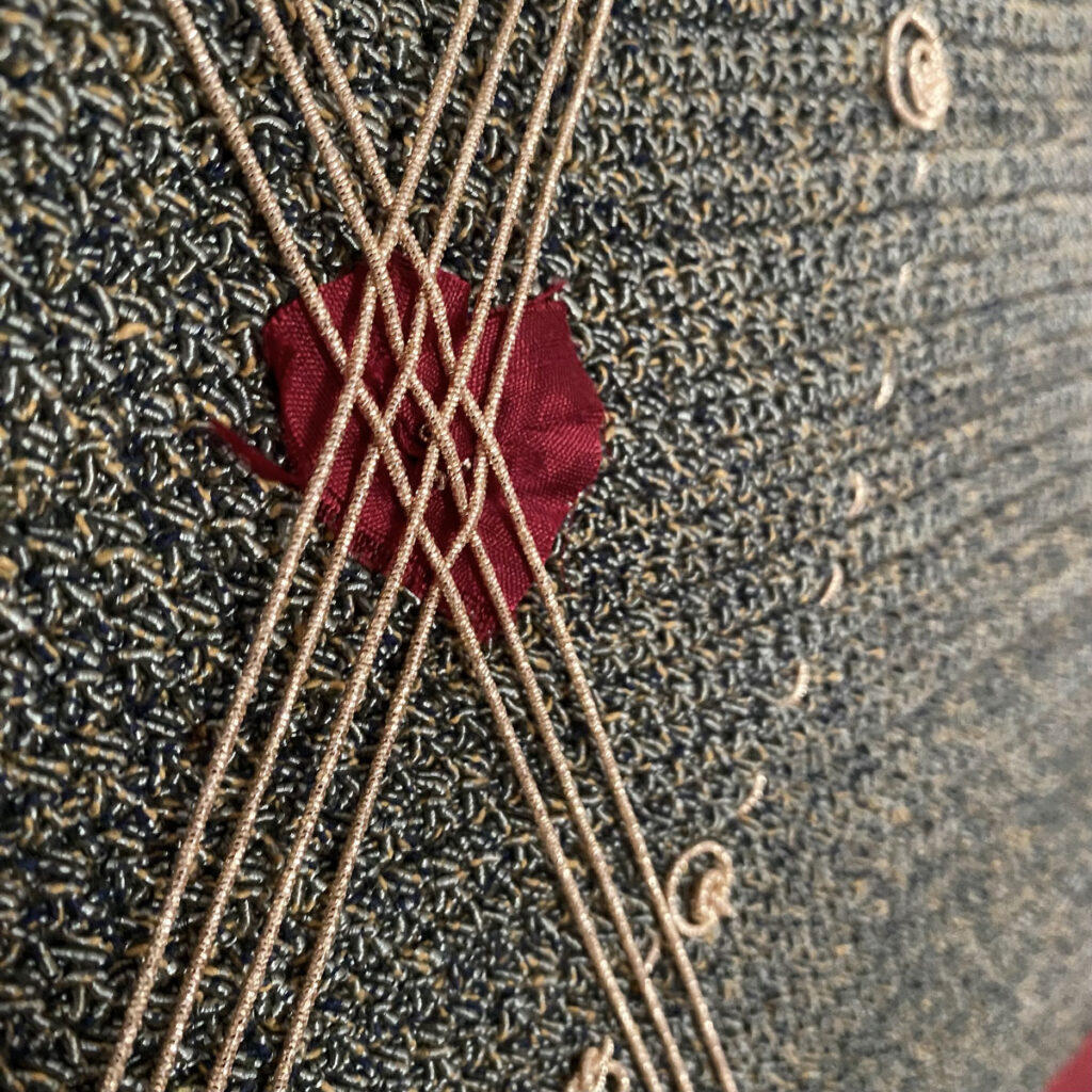 tessuto con ricamo ed applicazioni su rocchetto di legno